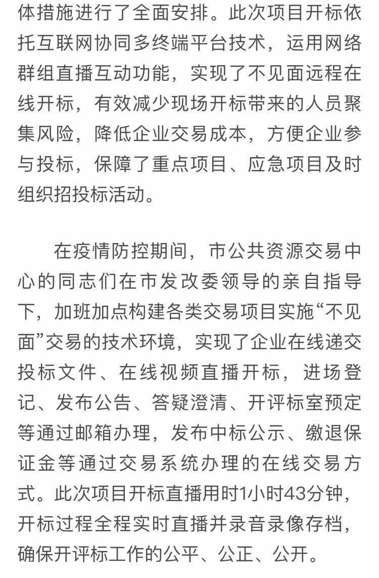 此次招標(biāo)依托互聯(lián)網(wǎng)協(xié)同多終端平臺(tái)技術(shù),運(yùn)用網(wǎng)絡(luò)群組直播互動(dòng)功能,實(shí)現(xiàn)了“不見(jiàn)面”遠(yuǎn)程在線開(kāi)標(biāo),有效避免了人員聚集和交叉感染的風(fēng)險(xiǎn),同時(shí)降低了企業(yè)交易成本,方便企業(yè)參與投標(biāo)。是疫情防控以來(lái)西安市公共資源交易中心首個(gè)恢復(fù)項(xiàng)目,在疫情防控的特殊時(shí)期,保障了我市重點(diǎn)、民生項(xiàng)目的順利推進(jìn),為我市發(fā)展電子化“不見(jiàn)面”招投標(biāo)提供了寶貴的經(jīng)驗(yàn)。