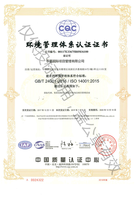 環境管理體系認證證書